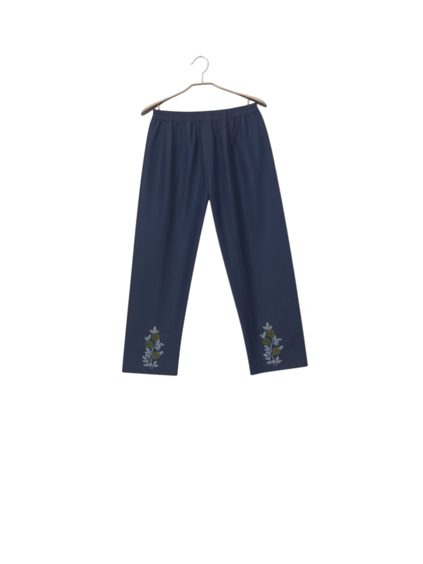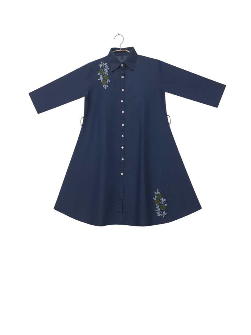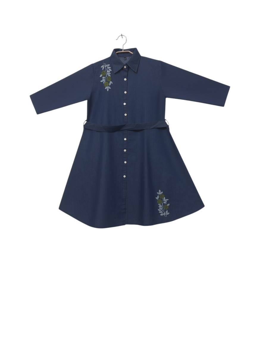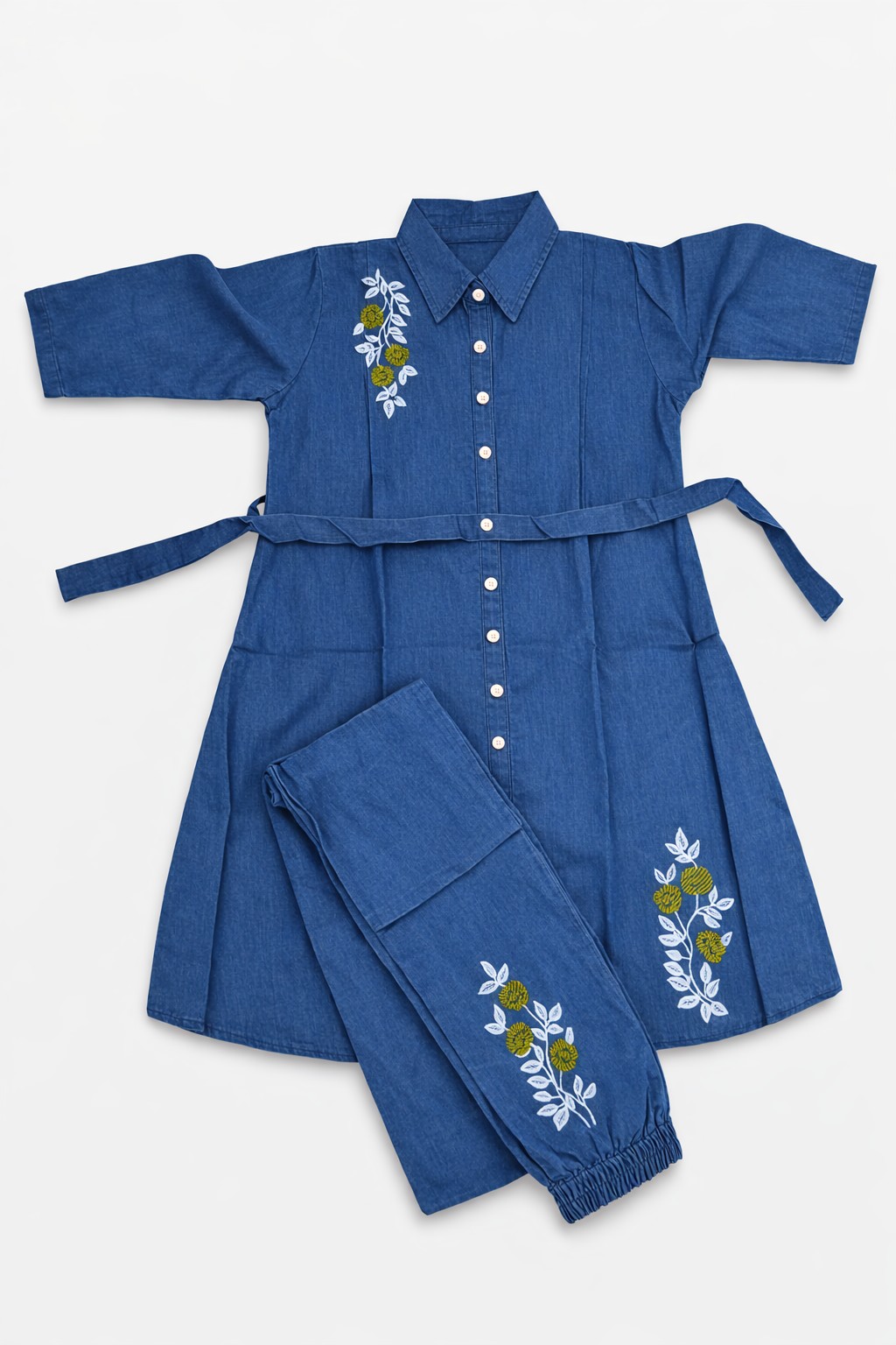 Floral Embroidered Denim Tunic & Jogger Set Elevate your casual wardrobe with our Floral Embroidered Denim Two-Piece Set. Crafted from soft, breathable denim, this set combines the timeless appeal of blue jeans with delicate artistry. The tunic features a flattering tie-waist and classic button-down front, while the matching joggers offer a relaxed, modern silhouette. Intricate green and white floral embroidery adds a touch of botanical charm, making this more than just your average denim outfit. Specifications Material: Cotton-blend Denim Color: Classic Indigo Blue Fit: Relaxed/Standard Care: Machine wash cold, inside out to protect embroidery.