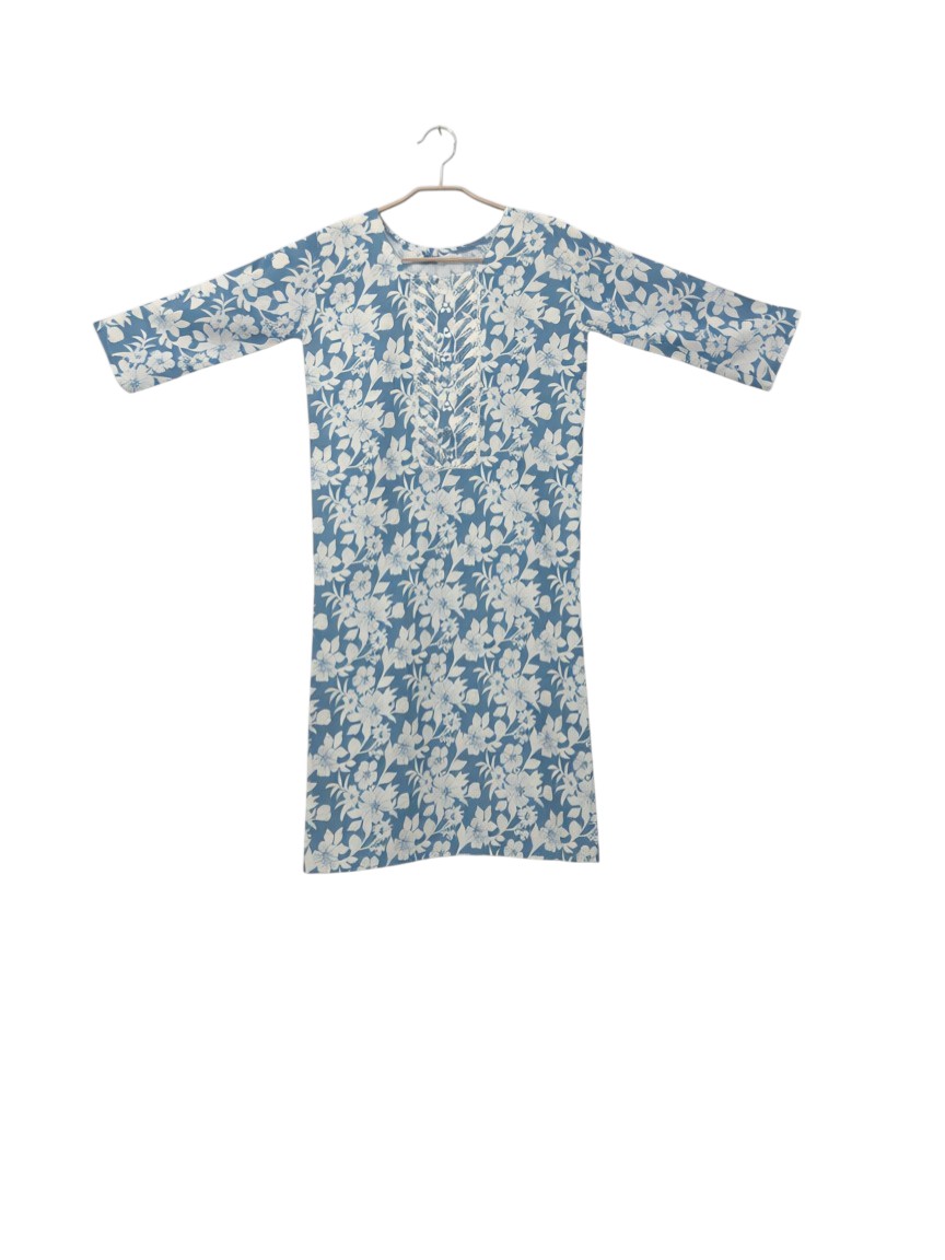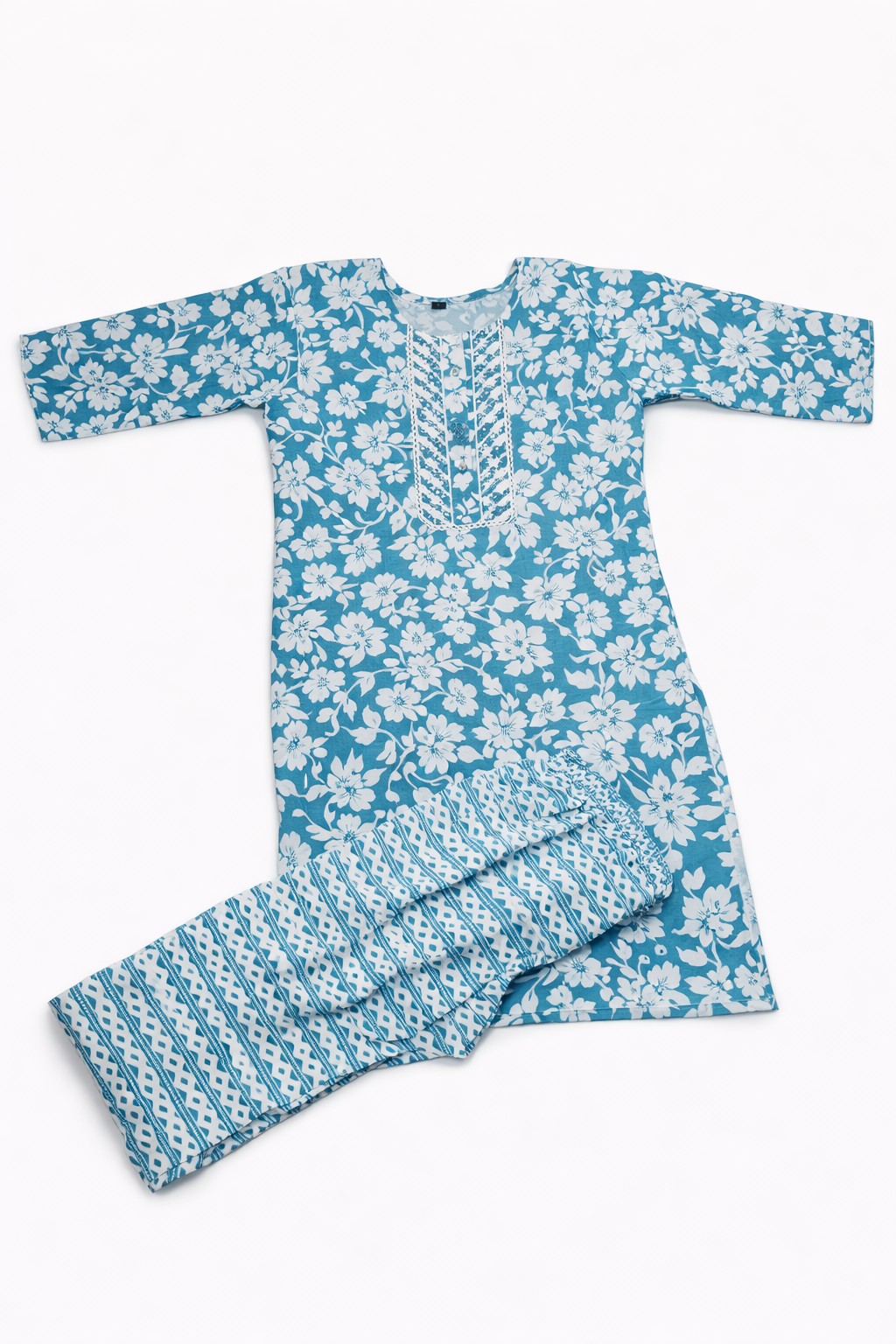 This vibrant blue and white set is the ultimate "breezy" outfit, perfect for daily wear, office hours, or a casual lunch date. The mix of floral and geometric prints gives it a fresh, modern ethnic vibe. Key Features :- Breathable Cotton Fabric: Made from premium lightweight cotton, ensuring maximum comfort and airflow for all-day wear. Artisanal Lace Detailing: The neckline features a beautiful white lace border and decorative buttons, adding a touch of elegance to the casual silhouette. Mix-and-Match Prints: Features a bold floral kurti paired with geometric-patterned pants for a trendy, coordinated aesthetic. Functional Design: The kurti includes side slits for easy movement, while the pants come with an elasticated waistband for a perfect, flexible fit. Versatile Three-Quarter Sleeves: Perfect for seasonal transitions, providing a classic look that works for both professional and casual settings. Vibrant Color Palette: The crisp white-on-blue print stays bright and fresh, wash after wash. Specifications :- Material: 100% Pure Cotton Color: Ocean Blue and Ivory White Set Includes: Straight Kurti and Printed Trousers Care: Gentle machine wash; iron on medium heat to maintain the crisp cotton finish.