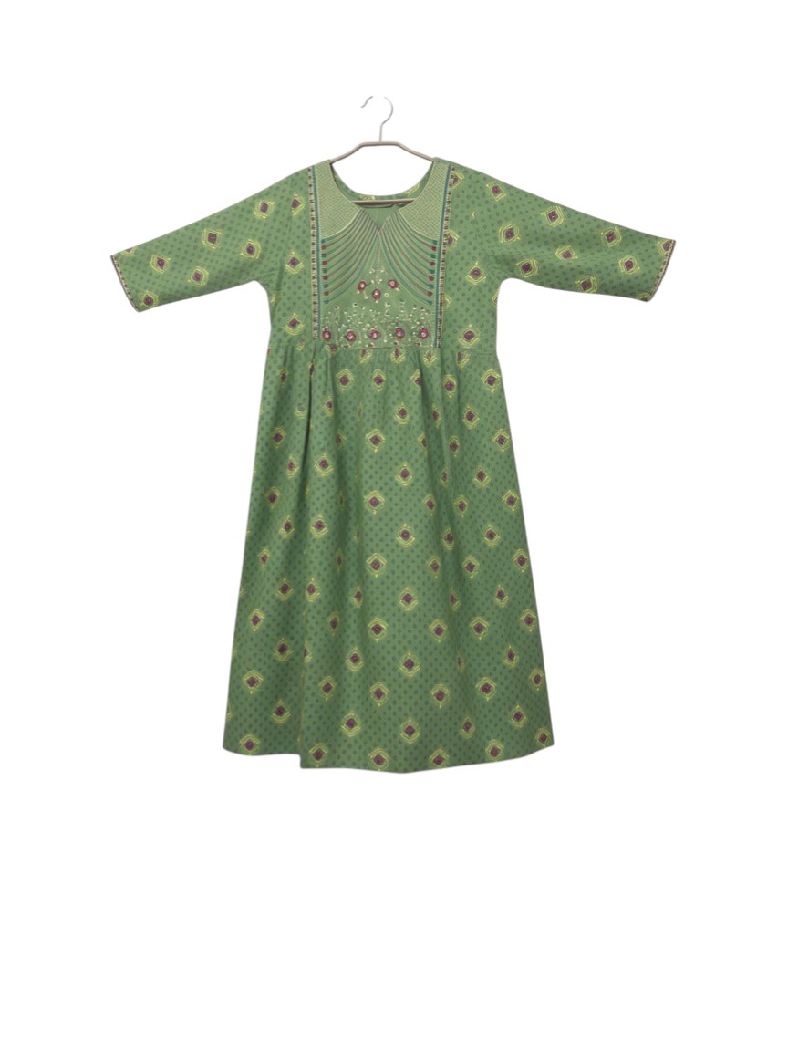 This sage green dress is an elegant celebration of traditional prints and detailed craftsmanship. Its gathered waist and intricate bodice work make it a charming choice for both festive gatherings and casual daywear. Key Features :- Intricately Embroidered Yoke: The neckline is adorned with multi-colored thread embroidery and delicate accents, creating a stunning focal point. Flattering Gathered Waist: The gentle gathers at the waistline add volume and movement, creating a feminine and comfortable fit. Premium Printed CottonBlend: Crafted from high-quality, breathable cottonBlend that features an all-over traditional block-print style motif. Elegant Three-Quarter Sleeves: Finished with a subtle embroidered border at the cuffs to match the neckline detailing. Versatile Silhouette: The mid-length "flare" design works beautifully as a standalone dress or paired with leggings or palazzos for a more traditional look. Soothing Color Palette: The sage green base provides a calm, earthy aesthetic that is perfect for any season. Specifications:- Material: Cotton Blend Color: Sage Green with Maroon and Gold accents Sleeve Style: Three-Quarter Sleeves Care: Gentle hand wash in cold water to preserve the vibrant prints and delicate embroidery.