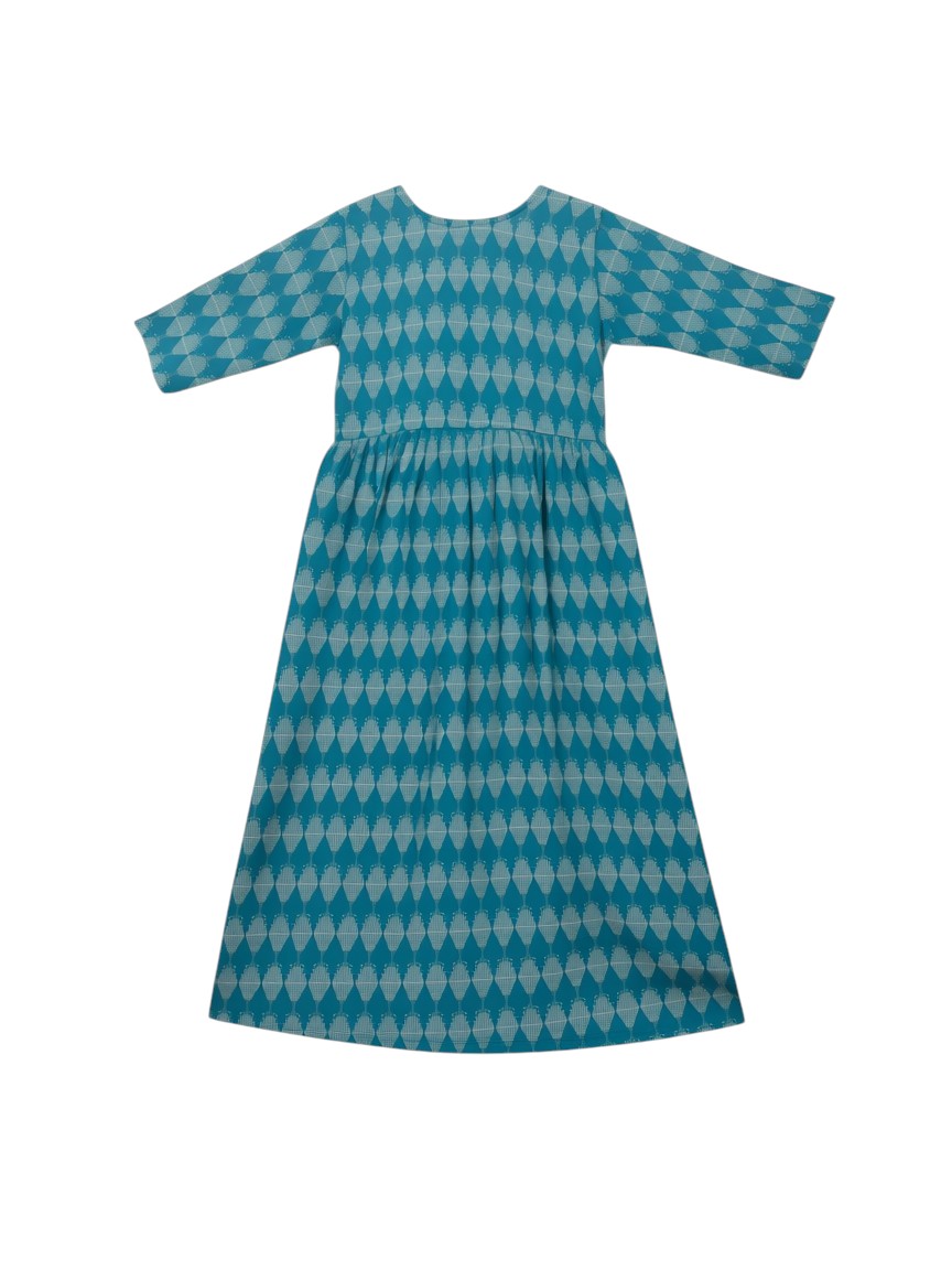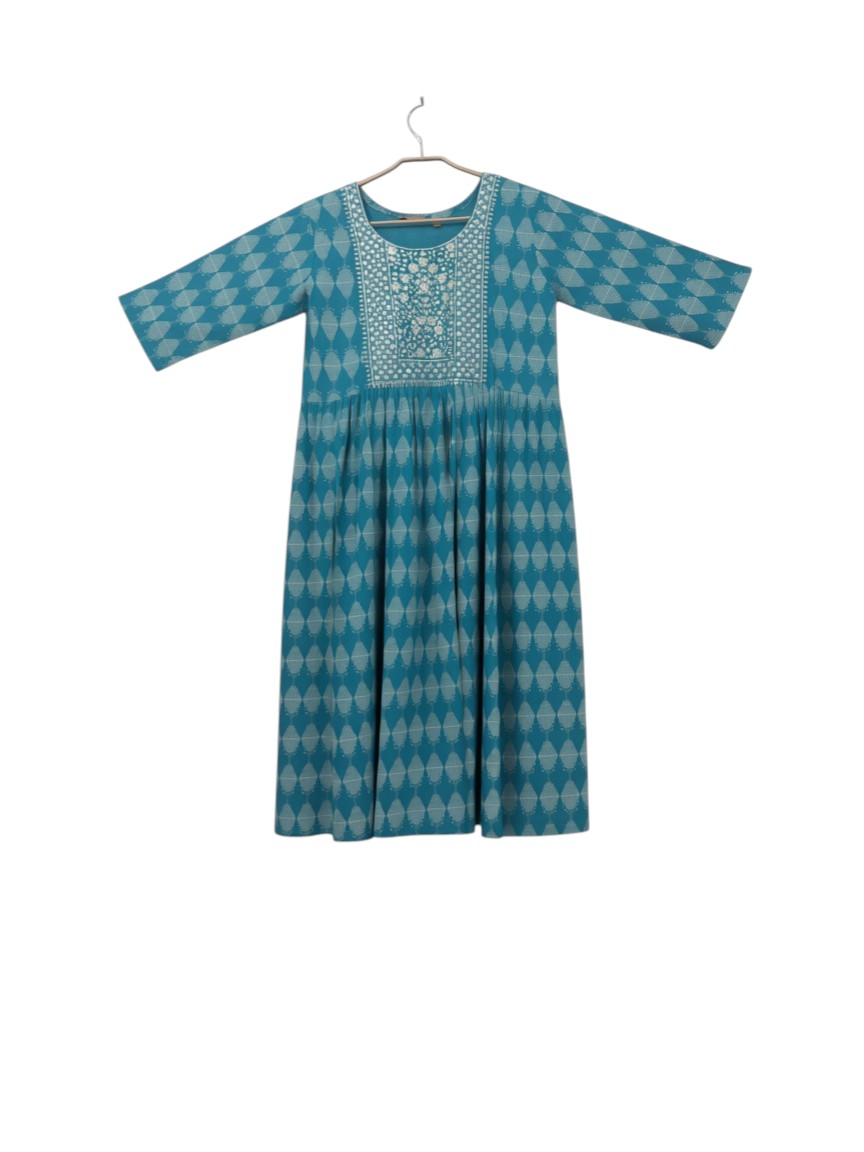 This vibrant teal Anarkali is a standout piece that combines a rich, jewel-toned palette with classic ethnic patterns. Its flowing silhouette and detailed embroidery make it an excellent choice for festive lunches or elegant everyday wear. Gemini said This vibrant teal Anarkali is a standout piece that combines a rich, jewel-toned palette with classic ethnic patterns. Its flowing silhouette and detailed embroidery make it an excellent choice for festive lunches or elegant everyday wear. Here is the product description and key features for your website: Teal Geometric Print Anarkali with Embroidered Yoke Add a splash of color to your ethnic collection with our Teal Geometric Anarkali. This dress features a striking all-over diamond motif that creates a modern, textured look. The bodice is highlighted by an intricate white-thread embroidered yoke, featuring traditional floral and geometric patterns that pop against the deep teal background. With its gathered waist and flared hemline, this piece offers a feminine, breezy fit that moves beautifully with you. Key Features :- Intricately Detailed Yoke: Features high-quality white thread embroidery at the neckline, providing a sophisticated contrast and artisanal feel. Flattering Anarkali Cut: The gathered waist transitions into a generous flare, offering a comfortable fit that suits a variety of body types. Modern Geometric Print: An all-over diamond pattern gives this traditional silhouette a contemporary, updated aesthetic. Soft & Breathable Fabric: Crafted from high-quality material designed to keep you comfortable and cool throughout the day. Versatile Styling: Wear it as a standalone midi dress for a fusion look, or pair it with white leggings or palazzos for a traditional ensemble. Coordinated Border Accents: The short sleeves are finished with a delicate embroidered border that perfectly complements the neckline. Specifications :- Material: Premium Cotton-Rayon Blend Color: Deep Teal and Ivory White Sleeve Style: Short Sleeves with Border Detail Care: Gentle hand wash or dry clean to maintain the crispness of the embroidery and the richness of the teal dye.