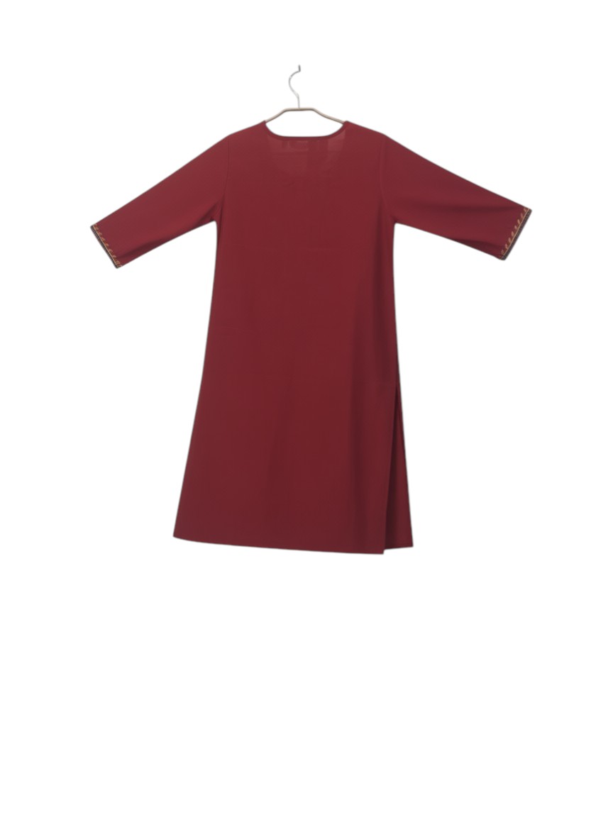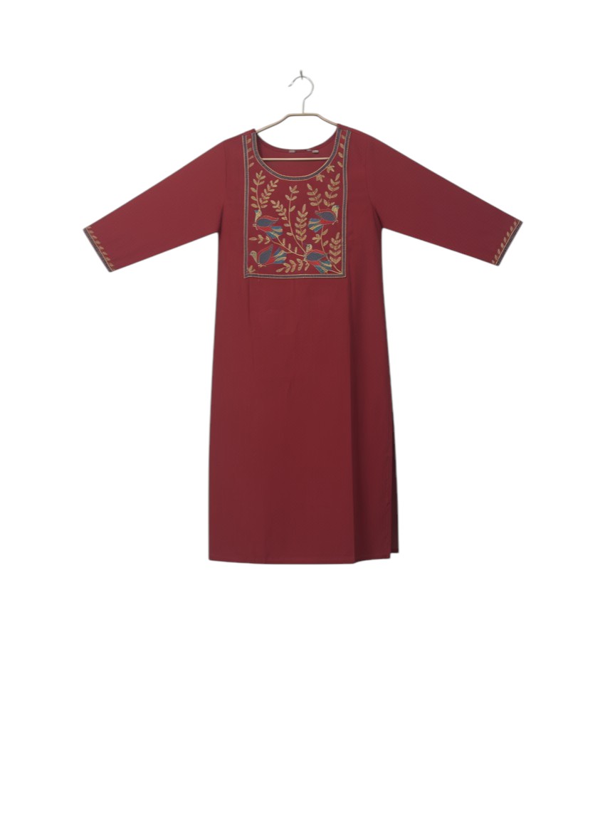 This vibrant red kurti is a beautiful blend of traditional motifs and modern style, perfect for adding a pop of color to your ethnic wardrobe. Gemini said This vibrant red kurti is a beautiful blend of traditional motifs and modern style, perfect for adding a pop of color to your ethnic wardrobe. Here is the product description and key features for your website: Ruby Red Embroidered Bird Motif Kurti Make a bold statement with our Ruby Red Embroidered Kurti. This piece features a rich, deep red hue that serves as the perfect canvas for its intricate artisanal details. The front is adorned with beautifully embroidered bird and vine motifs in gold and teal, creating a look that is both whimsical and sophisticated. With its clean round neckline and elegant finish, this kurti is an ideal choice for festive gatherings, office celebrations, or a special evening out. Key Features :- Artisanal Bird Embroidery: Features two striking, multi-colored bird motifs surrounded by elegant gold vine thread-work for a unique, handcrafted feel. Premium Fabric: Crafted from a high-quality, breathable fabric that offers a smooth texture and a subtle, natural sheen. Intricate Neckline Detail: The round neckline is highlighted with delicate gold and teal embroidery, framing the face beautifully. Vibrant Jewel Tone: The deep ruby red color is designed to stay rich and vibrant, offering a classic ethnic look that never goes out of style. Versatile Silhouette: A straight-cut design that pairs effortlessly with gold leggings, white palazzos, or even your favorite denim for a fusion twist. Comfortable Fit: Tailored to provide a relaxed yet structured fit, ensuring you look and feel your best all day long. Specifications :- Material: vatican fabric Color: Ruby Red with Gold, Teal, and Navy accents Neckline: Round with Embroidered Border Care: Gentle hand wash in cold water or dry clean to protect the intricate thread-work.